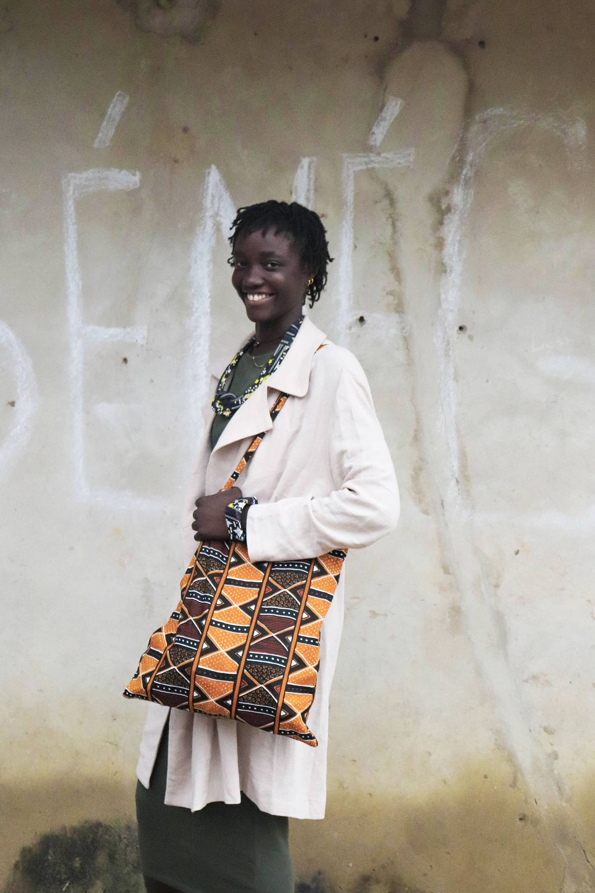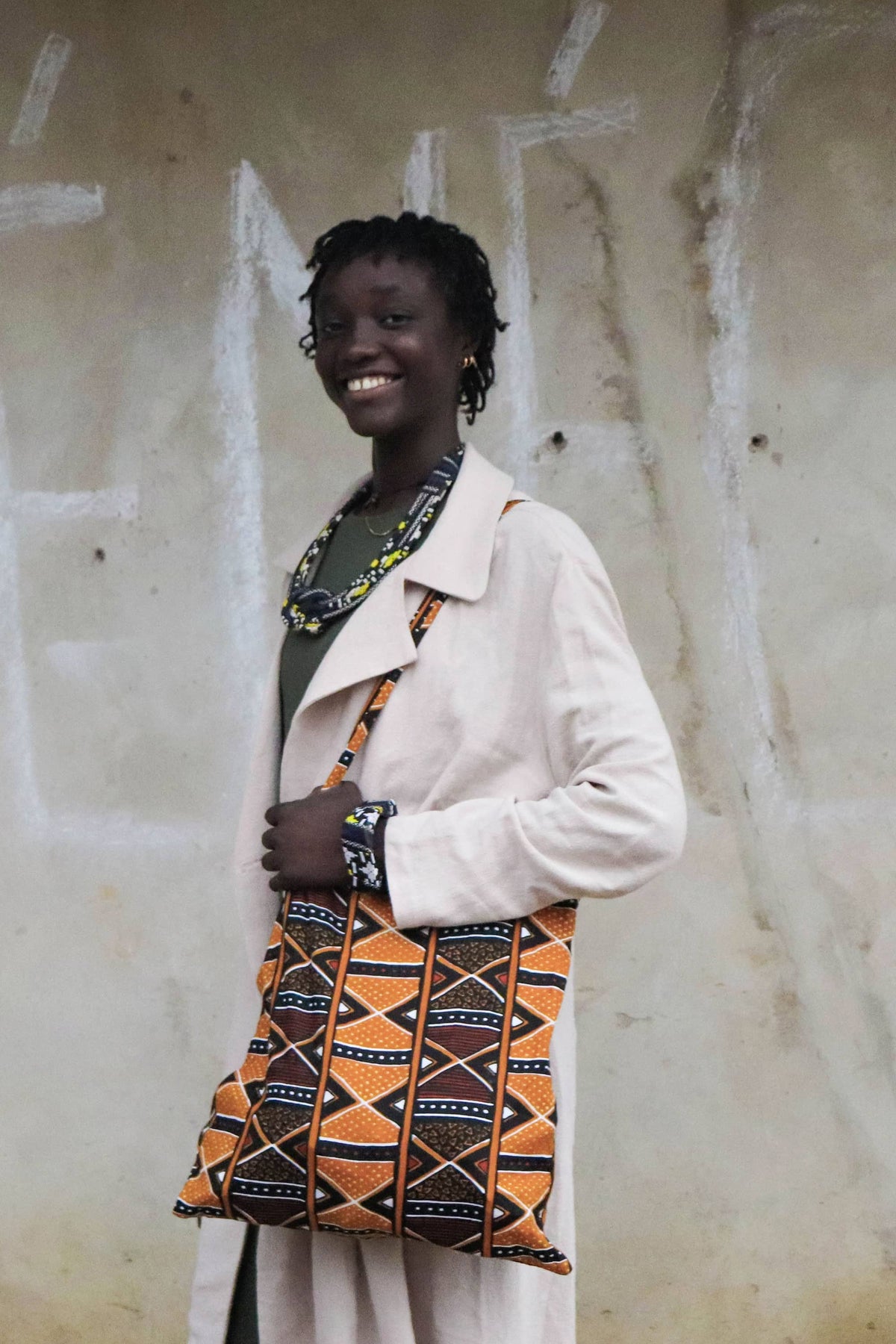 - La bolsa plegable está confeccionada con tela africana wax. El wax es la tela más conocida en África. Es de algodón 100% y está estampada con una impresión a base de capas de cera, de ahí su nombre.