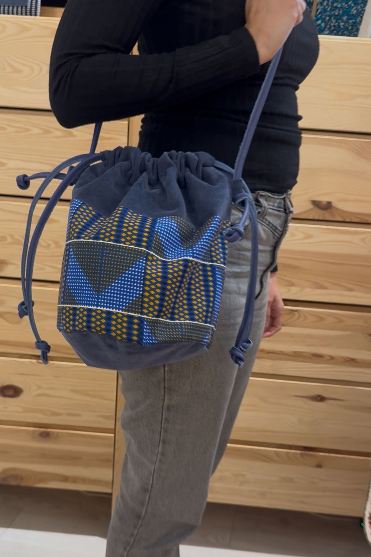 - Bolso bombonera de serraje combinado con tela africana wax.